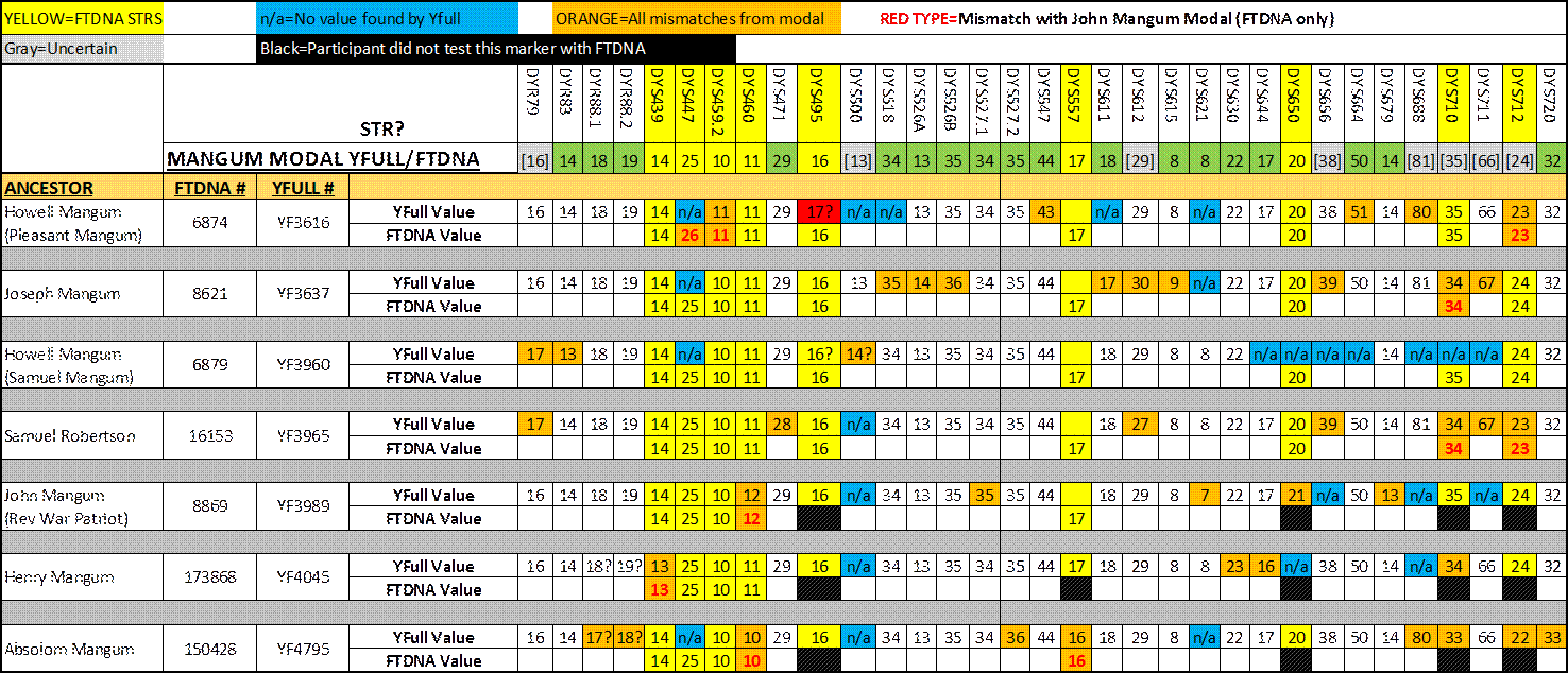 [16] We determine the Mangum modal as the majority marker value out of a group of participant’s results, and consider that this is the value passed down to us from John Mangum, our immigrant ancestor. This works well when we have many participants with a large majority having the same marker value, and only one or a few having a different value. The latter are therefore considered mutations from the modal. In a few instances, determining the majority value is difficult when there are only a few values available, as in some of the YFull results, and especially when those few values are varied. In some cases in YFull, we only have a single value, giving us a tentative modal value, but at very low confidence.